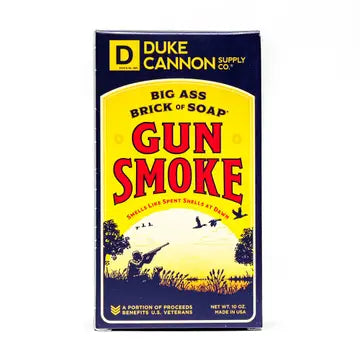 One of our most requested scents ever. An ideal fall Saturday in Duke Cannon Country involves just that — the country. There isn’t a minivan in sight, and the closest spoils of concrete are a good thirty miles away. While surrounded by your hunting buddies (two or four-legged), the sun pulls itself above the horizon line, and you’re filled with that particular adrenaline as your first shot rips across the sky. Our new Big Ass Brick of Soap – Gun Smoke attempts to capture that moment. The whiff you’ll get isn’t exactly metallic Cordite; rather, notes of smoked wood, bourbon vanilla, and charred leather combine to form a rich, slightly smoky scent that reminds you of a successful morning spent alongside your favorite fellow sportsmen.